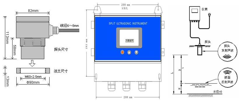 四、超聲波液位計外形尺寸圖及安裝示意圖: