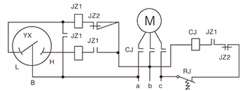 JZ1、JZ2-繼電器及觸點 CJ-接觸器及觸點 RJ-熱繼電器 M-電機 YX-電接點壓力表 L-下限接點(綠) H-上限接點(紅) B-公共接點(黃) |