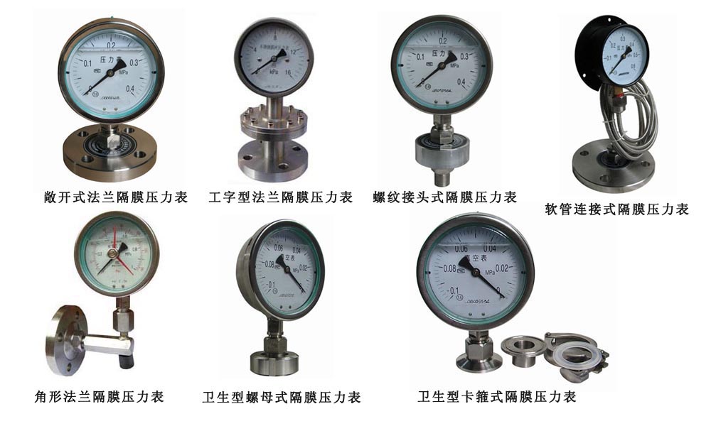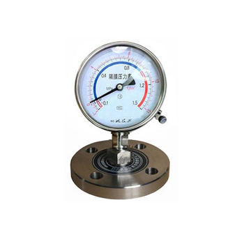 隔膜式壓力表由各種通用型壓力儀表和不同結構的隔膜隔離器組成一個封閉系統,內充密封液。當被測介質的壓力作用于隔膜時,則隔膜產生變形,壓縮封閉系統中的密封液。由于密封液的固有性質,使壓力儀表中的彈性元件產生相應的彈性變形—位移,經指示裝置顯示壓力值。當隔膜的剛度足夠小時,則壓力儀表指示的壓力就近于被測介質的壓力值。
